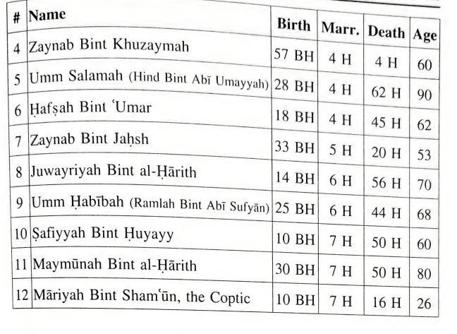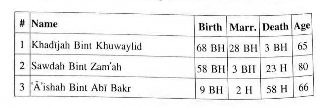 The following table summarizes some important dates concerning the Mothers of the Believers. “Marr.” refers to the year that they got married to the Prophet (pbuh). It should be noted that many of the following dates are approximate, and the historians considerably differ over some of them. For example, some historians say that Sawdah died in 5 H; others say that she died near the end of ‘Umar’s rule. We list below the dates that appeared most correct to us.