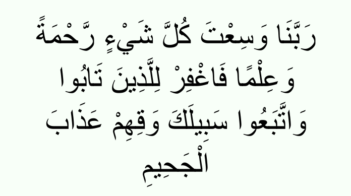 “Our Lord! You comprehend all things in mercy and knowledge, so forgive those who repent and follow Your Way, and save them from the torment of the blazing Fire!”